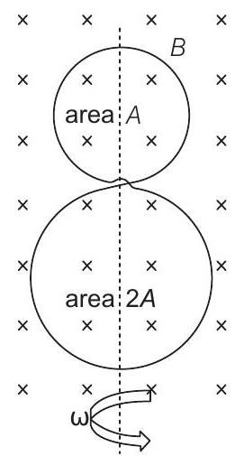 22. A circular insulated copper wire loop is twisted to form two loops of area $A$ and $2 A$ as shown in the figure. At the point of crossing the wires remain electrically insulated from each other. The entire loop lies in the plane (of the paper). A uniform magnetic field $\mathbf{B}$ points into the plane of the paper. At $t=0$, the loop starts rotating about the common diameter as axis with a constant angular velocity $\omega$ in the magnetic field. Which of the following options is/are correct?