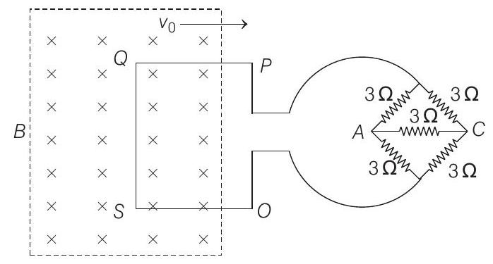 - A square metal wire loop of side $10 cm$ and resistance $1 \Omega$ is moved with a constant velocity $v _0$ in a uniform magnetic field of induction $B=2 Wb / m^{2}$ as shown in the figure. The magnetic field lines are perpendicular to the plane of the loop (directed into the paper). The loop is connected to a network of resistors each of value $3 \Omega$.