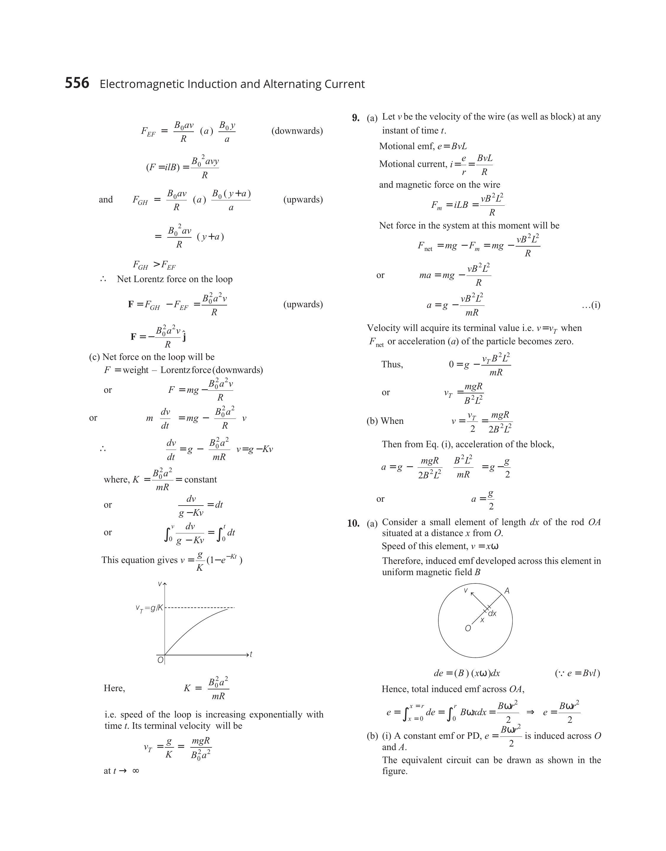 $$ \text { or } \quad \begin{array}{rlrl} F & =m g-\frac{B_{0}^{2} a^{2} v}{R} \\ \text { or } \quad m \frac{d v}{d t} & =m g-\frac{B_{0}^{2} a^{2}}{R} v \\ \therefore \quad & \frac{d v}{d t} & =g-\frac{B_{0}^{2} a^{2}}{m R} v=g-K v \end{array} $$