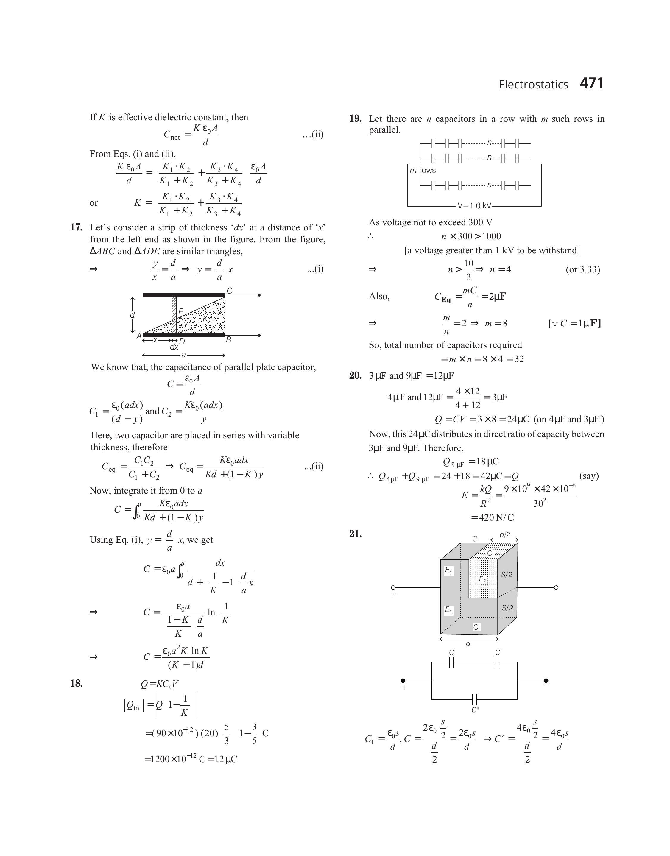 $ \begin{aligned} C & =\frac{\varepsilon_{0} A}{d} \\ C_{1}=\frac{\varepsilon_{0}(a d x)}{(d-y)} \text { and } C_{2} & =\frac{K \varepsilon_{0}(a d x)}{y} \end{aligned} $