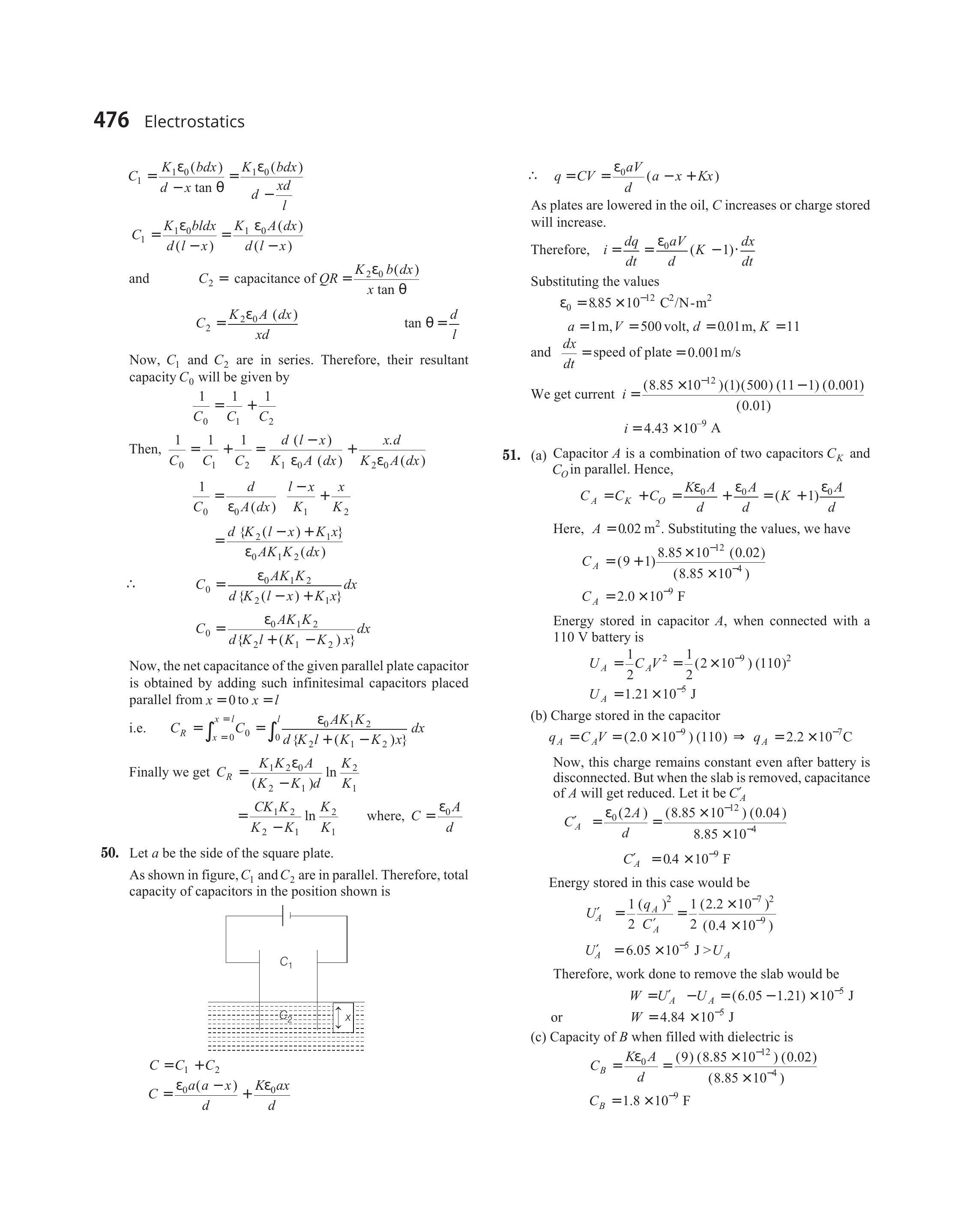 $$ \begin{aligned} & C=C_{1}+C_{2} \\ & C=\frac{\varepsilon_{0} a(a-x)}{d}+\frac{K \varepsilon_{0} a x}{d} \end{aligned} $$