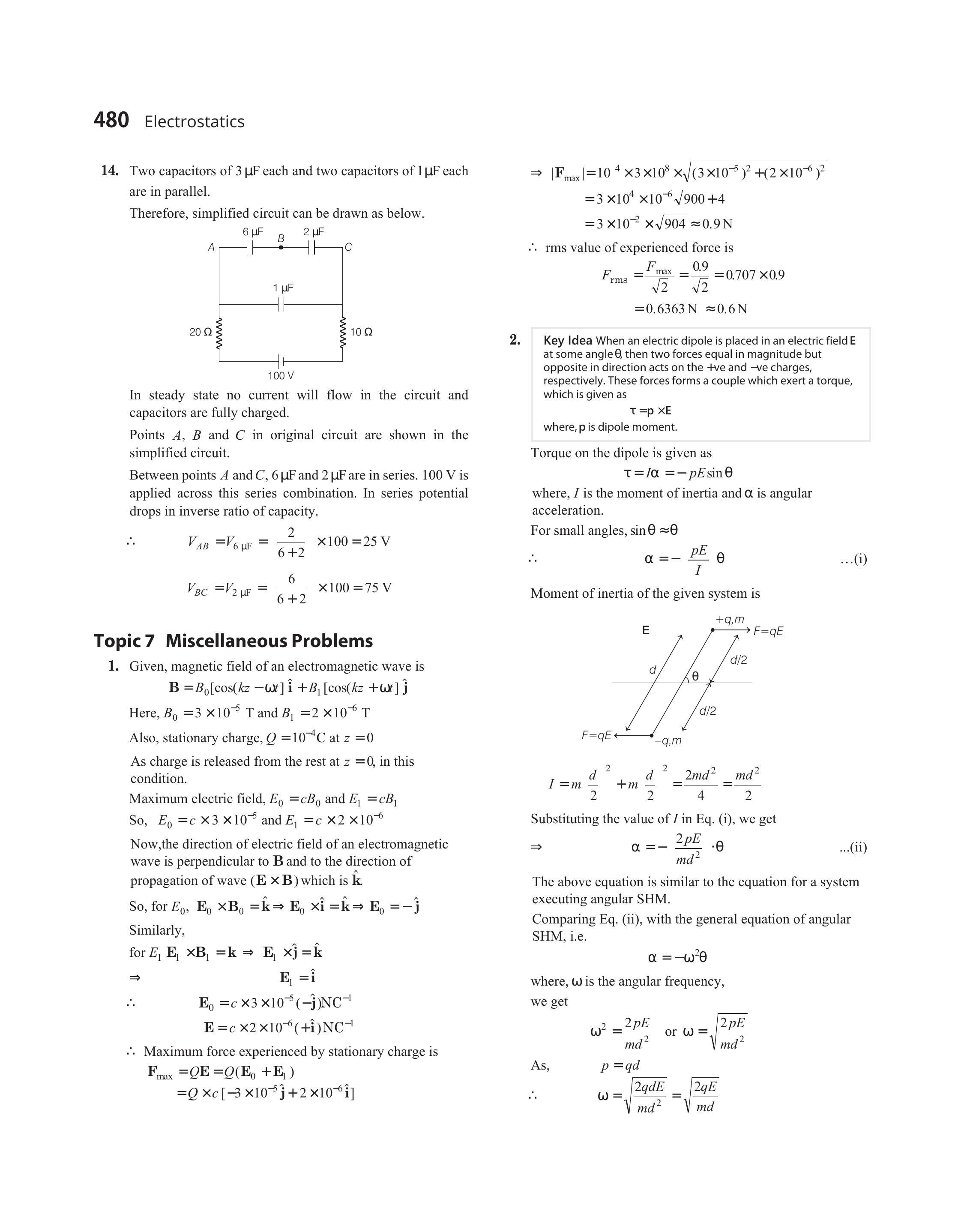 - An electric dipole is formed by two equal and opposite charges $q$ with separation $d$. The charges have same mass $m$. It is kept in a uniform electric field $E$. If it is slightly rotated from its equilibrium orientation, then its angular frequency $\omega$ is
