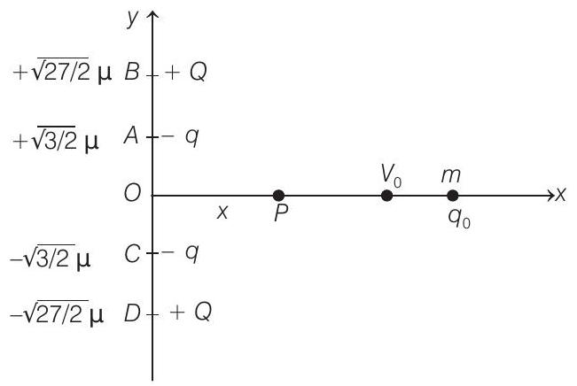 - Four point charges $+8 \mu \mathrm{C},-1 \mu \mathrm{C},-1 \mu \mathrm{C}$ and $+8 \mu \mathrm{C}$ are fixed at the points $-\sqrt{27 / 2} \mathrm{~m},-\sqrt{3 / 2} \mathrm{~m},+\sqrt{3 / 2} \mathrm{~m}$ and $+\sqrt{27 / 2} \mathrm{~m}$ respectively on the $y$-axis. A particle of mass $6 \times 10^{-4} \mathrm{~kg}$ and charge $+0.1 \mu \mathrm{C}$ moves along the $x$-direction. Its speed at $x=+\infty$ is $v_{0}$. Find the least value of $v_{0}$ for which the particle will cross the origin. Find also the kinetic energy of the particle at the origin. Assume that space is gravity free. $\left(1 / 4 \pi \varepsilon_{0}=9 \times 10^{9} \mathrm{Nm}^{2} / \mathrm{C}^{2}\right)$.