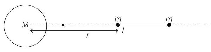 - A large spherical mass $M$ is fixed at one position and two identical masses $m$ are kept on a line passing through the centre of $M$ (see figure). The point masses are connected by a rigid massless rod of length $l$ and this assembly is free to move along the line connecting them. All three masses interact only through their mutual gravitational interaction. When the point mass nearer to $M$ is at a distance $r=3 l$ from $M$ the tension in the rod is zero for $m=k \frac{M}{288}$. The value of $k$ is