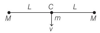 $$ \begin{alignedat} U_{c}+K_{c} & =U_{\infty}+K_{\infty} \\ \therefore \quad m V_{c}+\frac{1}{2} m v^{2} & =0+0 \\ \therefore \quad v & =\sqrt{-2 V_{c}}=\sqrt{(-2) \frac{-2 G M}{L^2}} \\ & = 2 \sqrt{\frac{G M}{L}} \end{aligned} $$