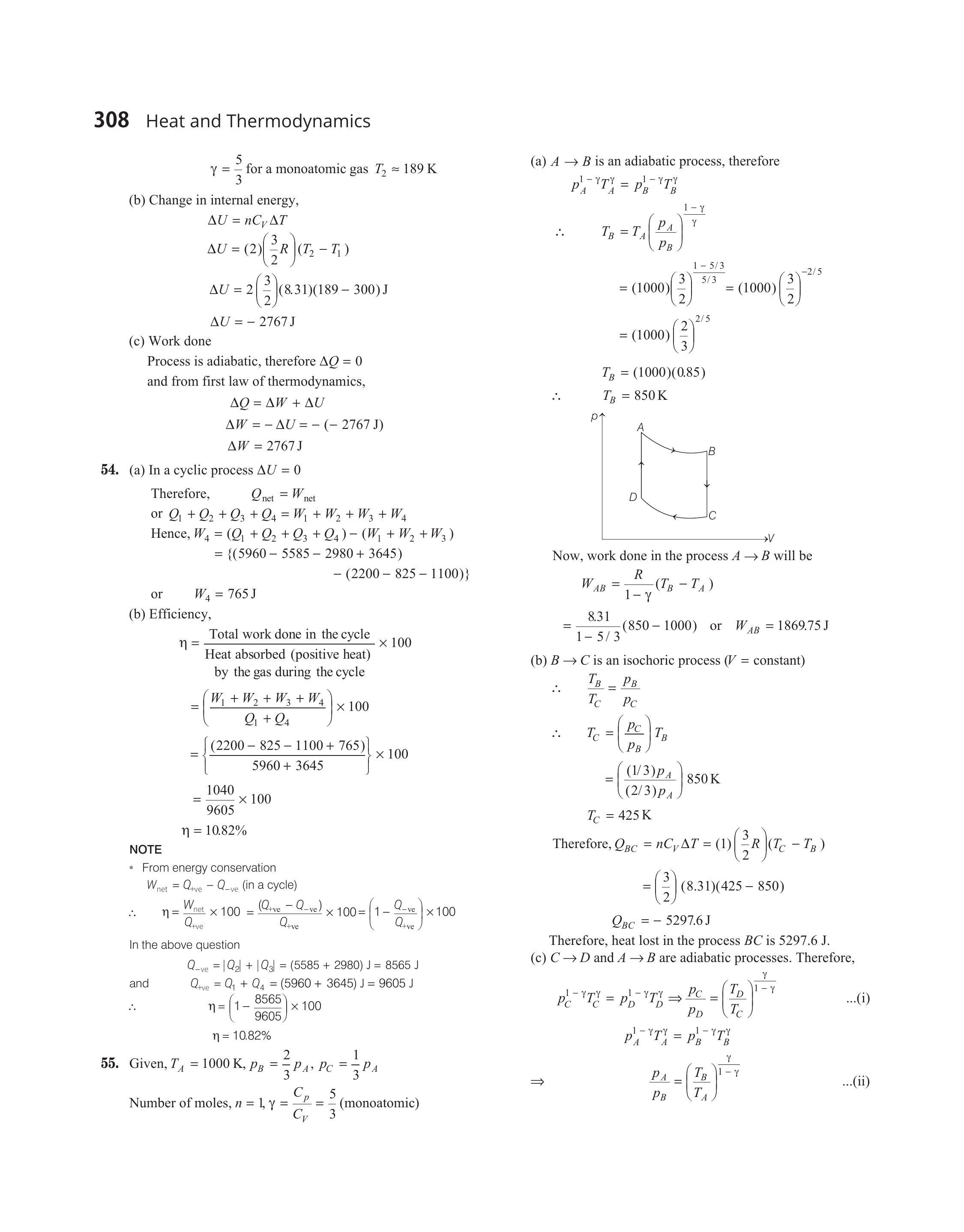 Number of moles, $n=1, \gamma=\frac{C _p}{C _V}=\frac{5}{3}$ (monoatomic) (a) $A \rightarrow B$ is an adiabatic process, therefore