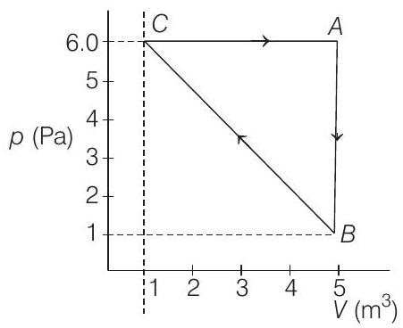 $$ \begin{aligned} V _2 & =5 m^{3}, V _1=1 m^{3} \\ p _2 & =6 Pa, p _1=1 Pa \\ & =\frac{1}{2}(5-1)(6-1)=\frac{1}{2} \times 4 \times 5=10 J \end{aligned} $$