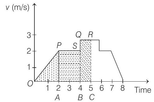 $\therefore$ Displacement of particle $=$ Area of triangle $O P A+$ Area of square $P A B S P+$ Area of rectangle $Q B C R Q$