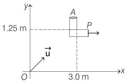 - An object $A$ is kept fixed at the point $x=3 m$ and $y=1.25 m$ on a plank $P$ raised above the ground. At time $t=0$, the plank starts moving along the $+x$-direction with an acceleration $1.5 m / s^{2}$. At the same instant, a stone is projected from the origin with a velocity $\mathbf{u}$ as shown. A stationary person on the ground observes the stone hitting the object during its downward motion at an angle of $45^{\circ}$ to the horizontal. All the motions are in $x-y$ plane. Find $\mathbf{u}$ and the time after which the stone hits the object. (Take $g=10 m / s^{2}$ ).