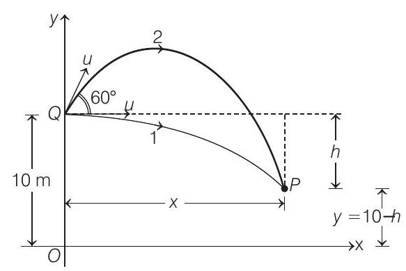 $$ \begin{array}{cc} & x=\left(u \cos 60^{\circ}\right) t _2=u t _1 \\ \text { or } & x=2.5 \sqrt{3} t _2=5 \sqrt{3} t _1 \\ \text { or } & t _2=2 t _1 \\ \text { and } & h=\left|\left(u \sin 60^{\circ}\right) t _2-\frac{1}{2} g t _2^{2}\right|=\frac{1}{2} g t _1^{2} \\ \text { or } & h=\frac{1}{2} g t _2^{2}-\left(u \sin 60^{\circ}\right) t _2=\frac{1}{2} g t _1^{2} \end{array} $$