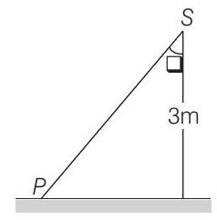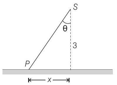 - Spotlight $S$ rotates in a horizontal plane with constant angular velocity of 0.1 $rad / s$. The spot of light $P$ moves along the wall at a distance of $3 m$. The velocity of the spot $P$ when $\theta=45^{\circ}$ (see fig.) is…… $m / s$.