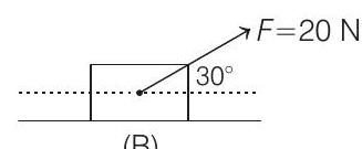 - A block of mass $5 \mathrm{~kg}$ is (i) pushed in case (A) and (ii) pulled in case (B), by a force $F=20 \mathrm{~N}$, making an angle of $30^{\circ}$ with the horizontal, as shown in the figures. The coefficient of friction between the block, the floor is $\mu=0.2$. The difference between the accelerations of the block, in case (B) and case (A) will be (Take, $g=10 \mathrm{~ms}^{-2}$ )