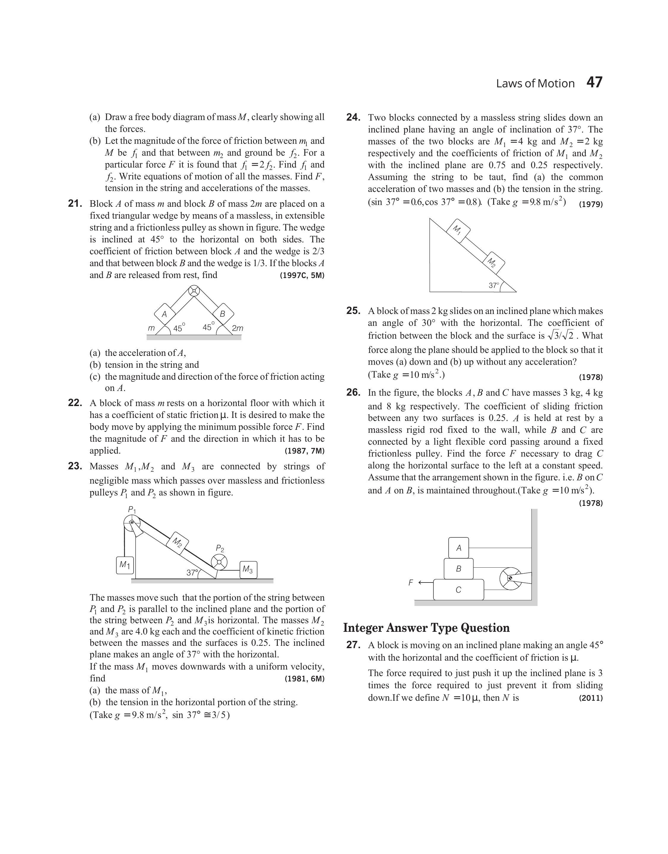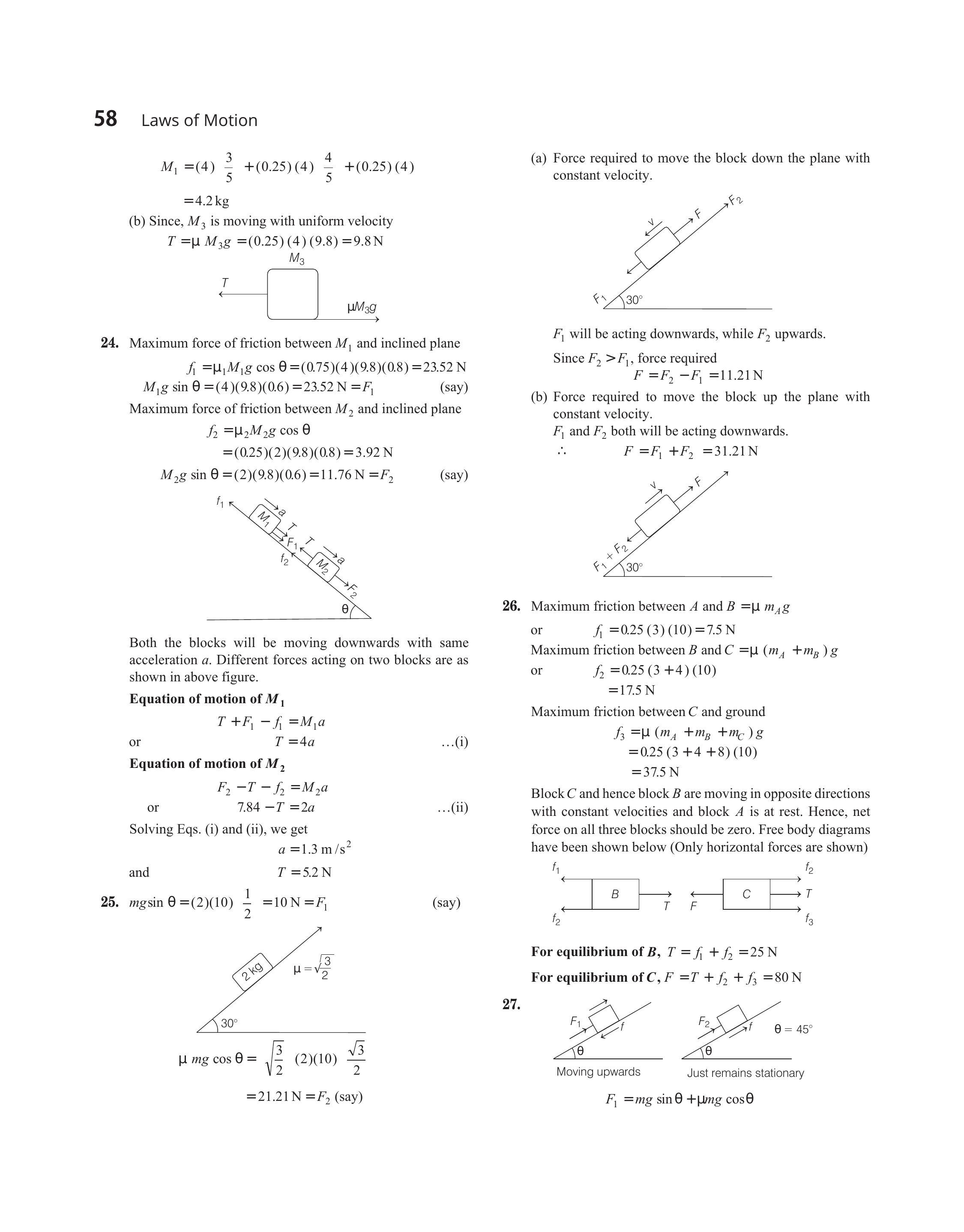 $$ \begin{aligned} f_{1} & =\mu_{1} M_{1} g \cos \theta=(0.75)(4)(9.8)(0.8)=23.52 \mathrm{~N} \\ M_{1} g \sin \theta & =(4)(9.8)(0.6)=23.52 \mathrm{~N}=F_{1} \quad (say) \end{aligned} $$