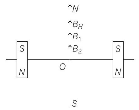 $$ \begin{aligned} B _{net} & =\frac{\mu _0}{4 \pi} \frac{\left(M _1+M _2\right)}{r^{2}}+B _H \\ & =\frac{10^{-7}(1.2+1)}{(0.1)^{3}}+3.6 \times 10^{-5} \\ & =2.56 \times 10^{-4} Wb / m^{2} \end{aligned} $$