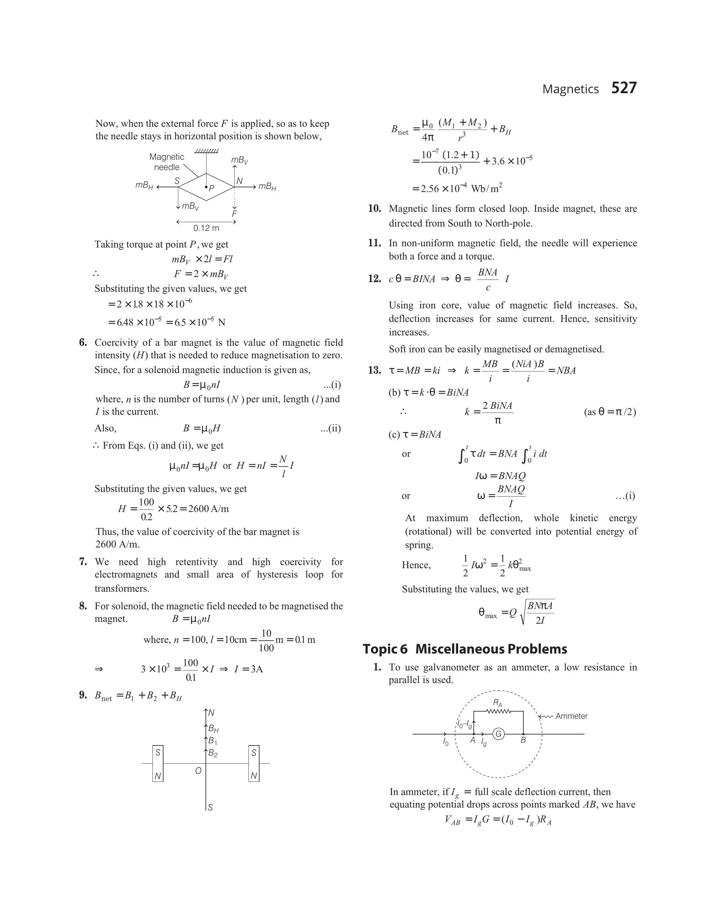 $$ \begin{aligned} B _{net} & =\frac{\mu _0}{4 \pi} \frac{\left(M _1+M _2\right)}{r^{2}}+B _H \\ & =\frac{10^{-7}(1.2+1)}{(0.1)^{3}}+3.6 \times 10^{-5} \\ & =2.56 \times 10^{-4} Wb / m^{2} \end{aligned} $$