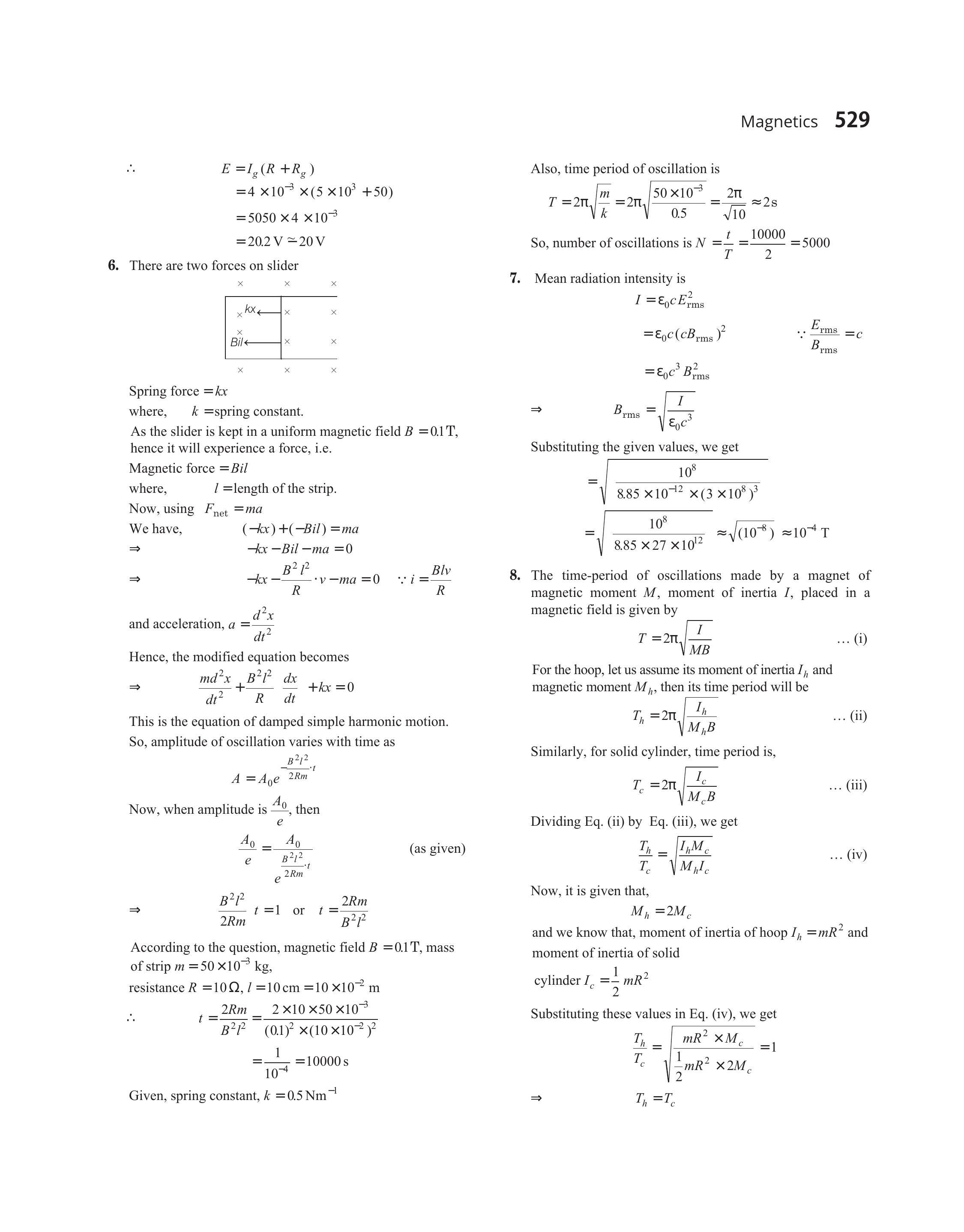 $ \begin{array}{ll} \Rightarrow & -k x-B i l-m a=0 \\ \Rightarrow & -k x-\frac{B^{2} l^{2}}{R} \cdot v-m a=0 \quad [\because i=\frac{B l v}{R}] \end{array} $