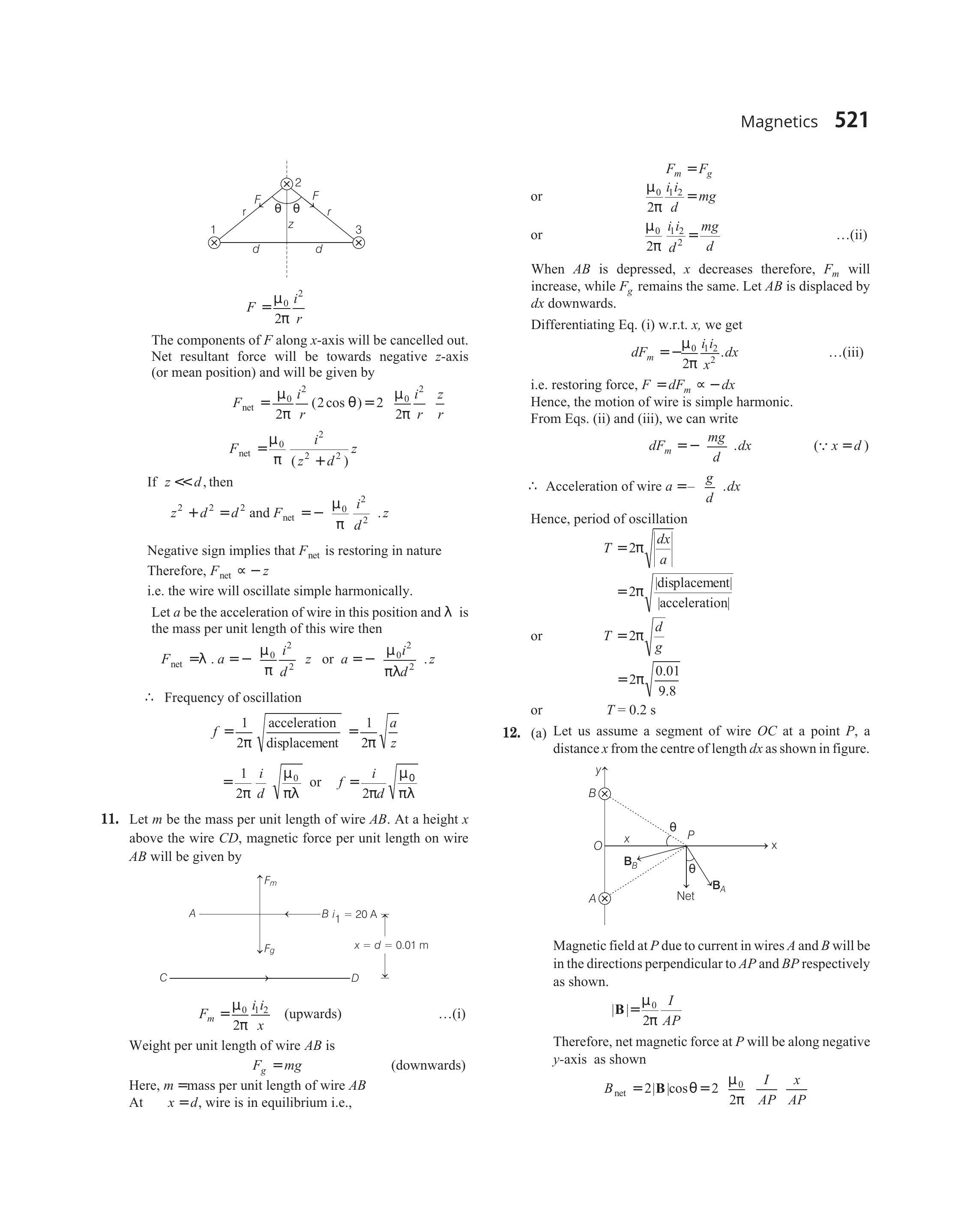 $ F _m=\frac{\mu _0}{2 \pi} \frac{i _1 i _2}{x} \quad \text { (upwards) } \quad …….(i) $