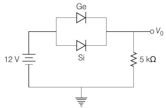 - At $0.3 $ $V$ and $0.7$ $ V$, the diodes $Ge$ and $Si$ become conductor respectively. In given figure, if ends of diode $Ge$ overturned, the change in potential $V _0$ will be
