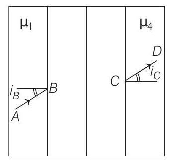 - A ray of light passes through four transparent media with refractive indices $\mu _1, \mu _2, \mu _3$ and $\mu _4$ as shown in the figure. The surfaces of all media are parallel. If the emergent ray $C D$ is parallel to the incident ray $A B$, we must have