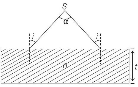 - A diverging beam of light from a point source $S$ having divergence angle $\alpha$ falls symmetrically on a glass slab as shown. The angles of incidence of the two extreme rays are equal. If the thickness of the glass slab is $t$ and its refractive index is $n$, then the divergence angle of the emergent beam is