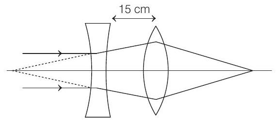 - A diverging lens with magnitude of focal length $25$ $ cm$ is placed at a distance of $15$ $ cm$ from a converging lens of magnitude of focal length $20$ $ cm$. A beam of parallel light falls on the diverging lens. The final image formed is