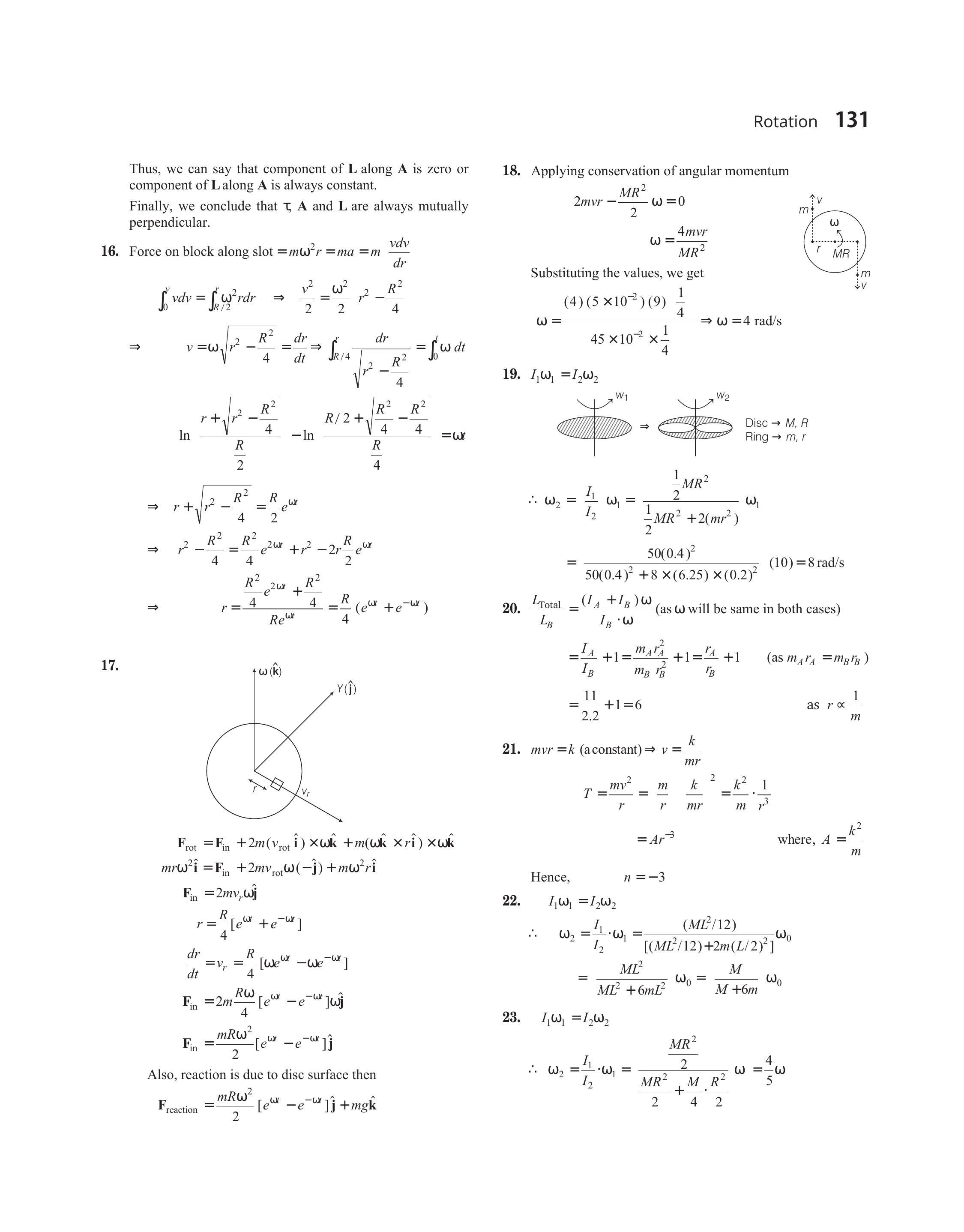$$ \begin{aligned} & \therefore \omega _2=\frac{I _1}{I _2} \omega _1=\frac{\frac{1}{2} M R^{2}}{\frac{1}{2} M R^{2}+2\left(m r^{2}\right)} \omega _1 \\ & =\frac{50(0.4)^{2}}{50(0.4)^{2}+8 \times(6.25) \times(0.2)^{2}} \quad(10)=8 rad / s \end{aligned} $$