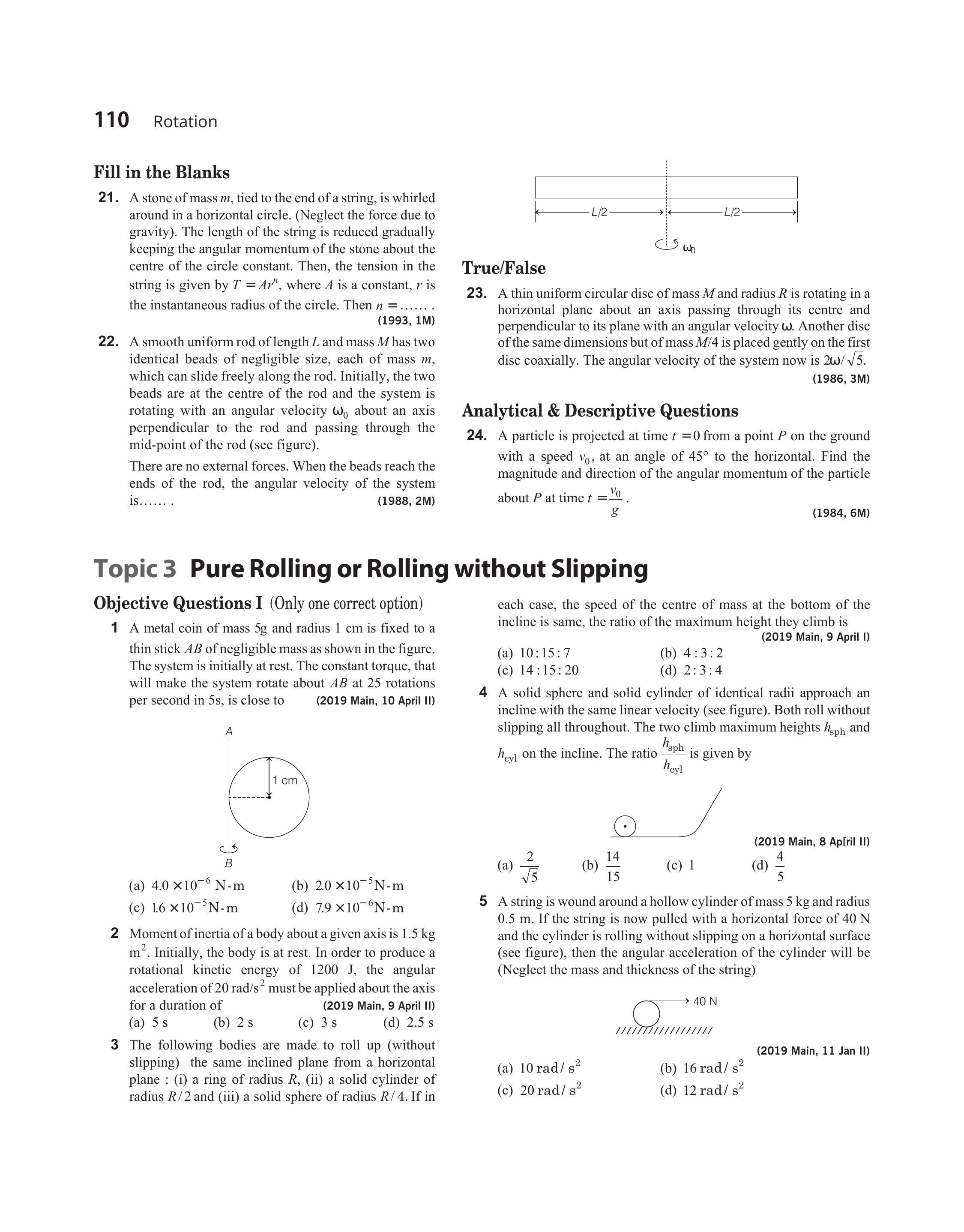 - A smooth uniform rod of length $L$ and mass $M$ has two identical beads of negligible size, each of mass $m$, which can slide freely along the rod. Initially, the two beads are at the centre of the rod and the system is rotating with an angular velocity $\omega _0$ about an axis perpendicular to the rod and passing through the mid-point of the rod (see figure).
