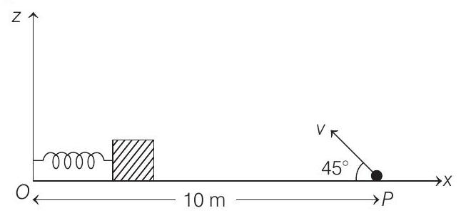 - A small block is connected to one end of a massless spring of unstretched length $4.9 m$. The other end of the spring (see the figure) is fixed. The system lies on a horizontal frictionless surface. The block is stretched by $0.2 m$ and released from rest at $t=0$. It then executes simple harmonic motion with angular frequency $\omega=\frac{\pi}{3} rad / s$. Simultaneously at $t=0$, a small pebble is projected with speed $v$ from point $P$ at an angle of $45^{\circ}$ as shown in the figure.