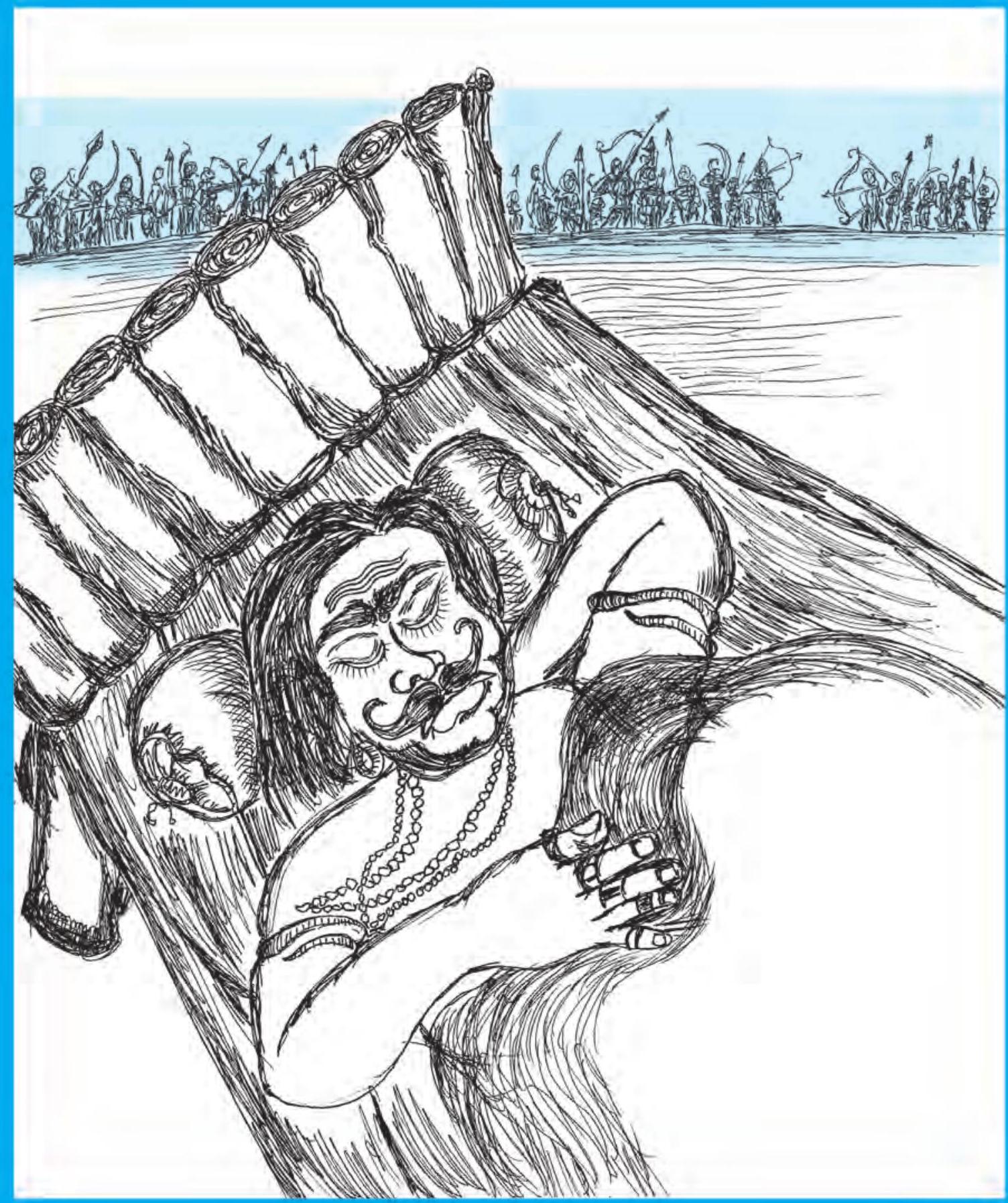 अब तक रावण को राम की शक्ति का कुछ अनुमान हो गया था। जब उसे कोई और रास्ता नहीं सूझा तो उसने कुंभकर्ण को जगाया। वह महाबली था पर छह महीने सोता था। कुंभकर्ण दुर्ग से बाहर आया। उसे देखते ही वानर सेना में खलबली मच गई। वे उसे रोकने में अक्षम थे। उसने हनुमान और अंगद को घायल कर दिया। लक्ष्मण यह युद्ध देख रहे थे। उन्होंने राम की ओर देखा।