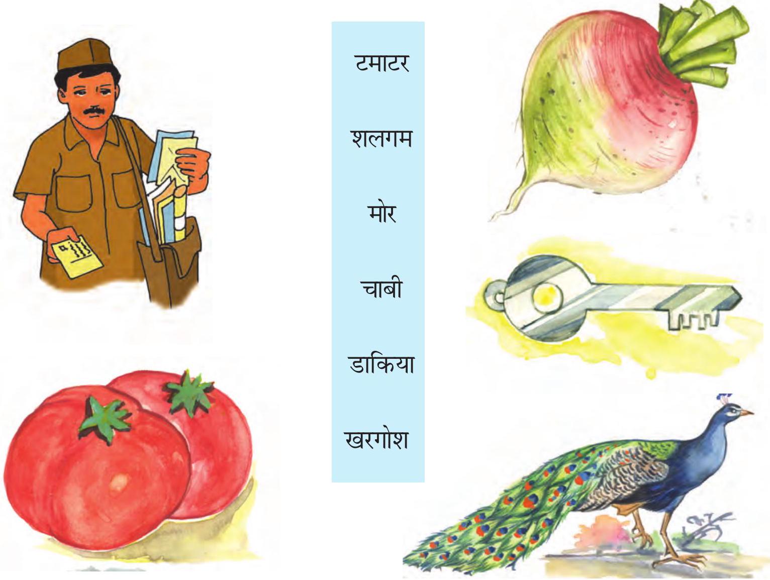 • इसी तरह ओखली, खरगोश, चाबी, डाकिया, शलगम के चित्र दिखाएँ। वर्णों की अलग-अलग पहचान करवाते हुए बार-बार बुलवाएँ।