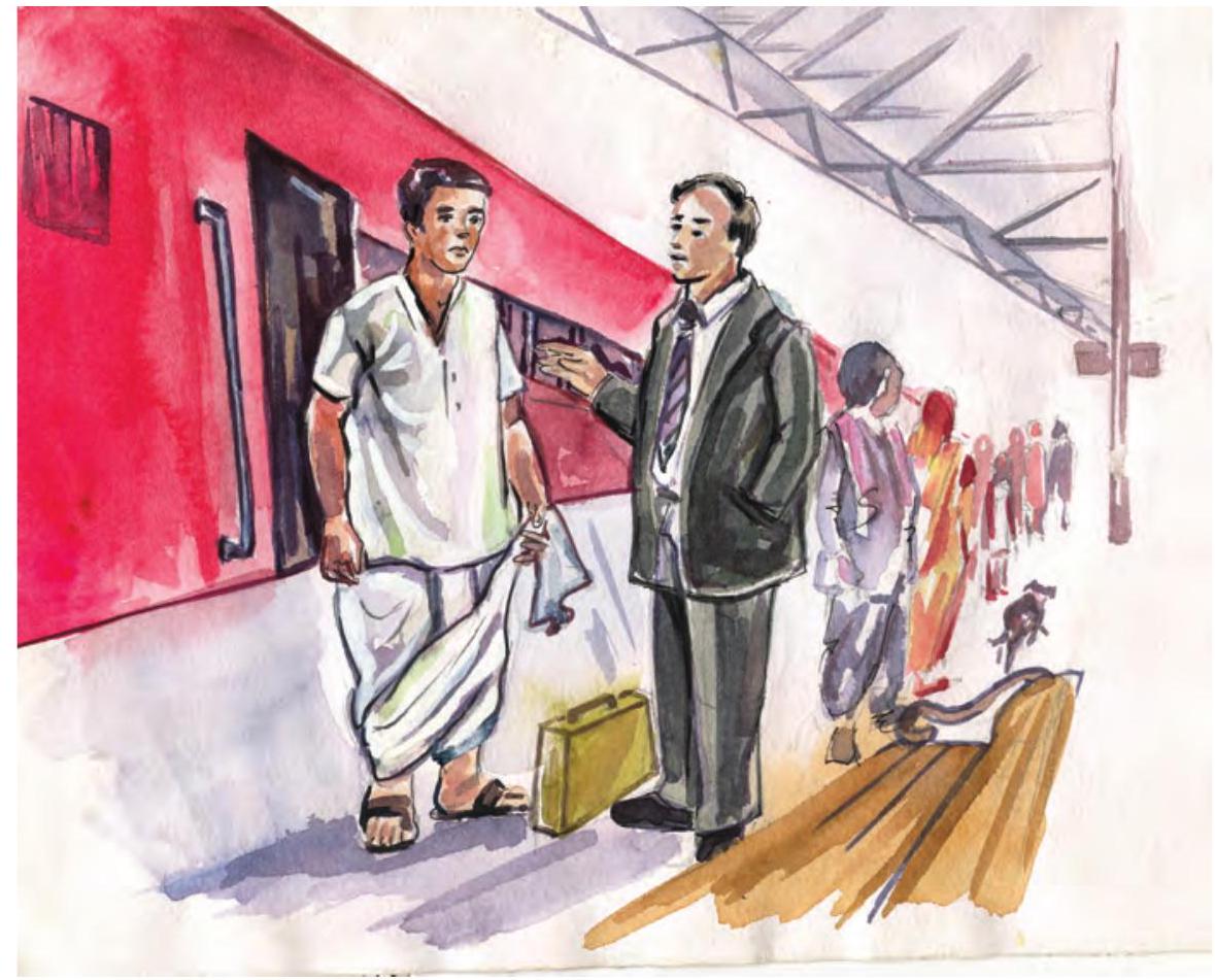 उसी गाड़ी से एक और आदमी उतरा। वह बहुत सादी पोशाक में था। वह आधी बाँह का कुर्ता, धोती और चप्पल पहने था। वह आदमी उस युवक के पास आया और बोला, ‘क्या बात है भाई?’ युवक बहुत गुस्से में था। वह बोला, ‘यह कैसा स्टेशन है? यहाँ एक भी कुली नहीं है। मेरे पास सामान है।’ तब वह आदमी बोला, ‘लाइए मैं आपका सामान उठा लूँ।’ वह आदमी युवक का सूटकेस उठाकर स्टेशन से बाहर आया। जब उस युवक ने मजदूरी के पैसे देने चाहे तो वह व्यक्ति बोला, ‘मुझे पैसे नहीं चाहिए।’ वहाँ कुछ बैलगाड़ियाँ खड़ी थीं। युवक एक बैलगाड़ी में बैठ गया।