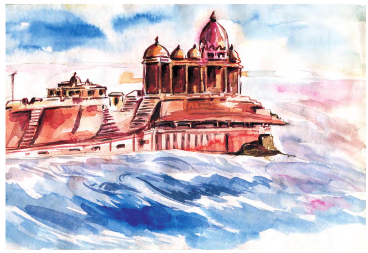 पिता : विवेकानंद स्मारक कन्याकुमारी के पास समुद्र के किनारे थोड़ी दूर पर एक बड़ी चट्टान पर बना है। हम लोग मोटर लांच से स्मारक पहुँचेंगे। वहाँ पर विवेकानंद और रामकृष्ण परमहंस की मूर्तियाँ हैं। चट्टान पर खड़े होकर हम समुद्र की लहरों का आनंद लेंगे।