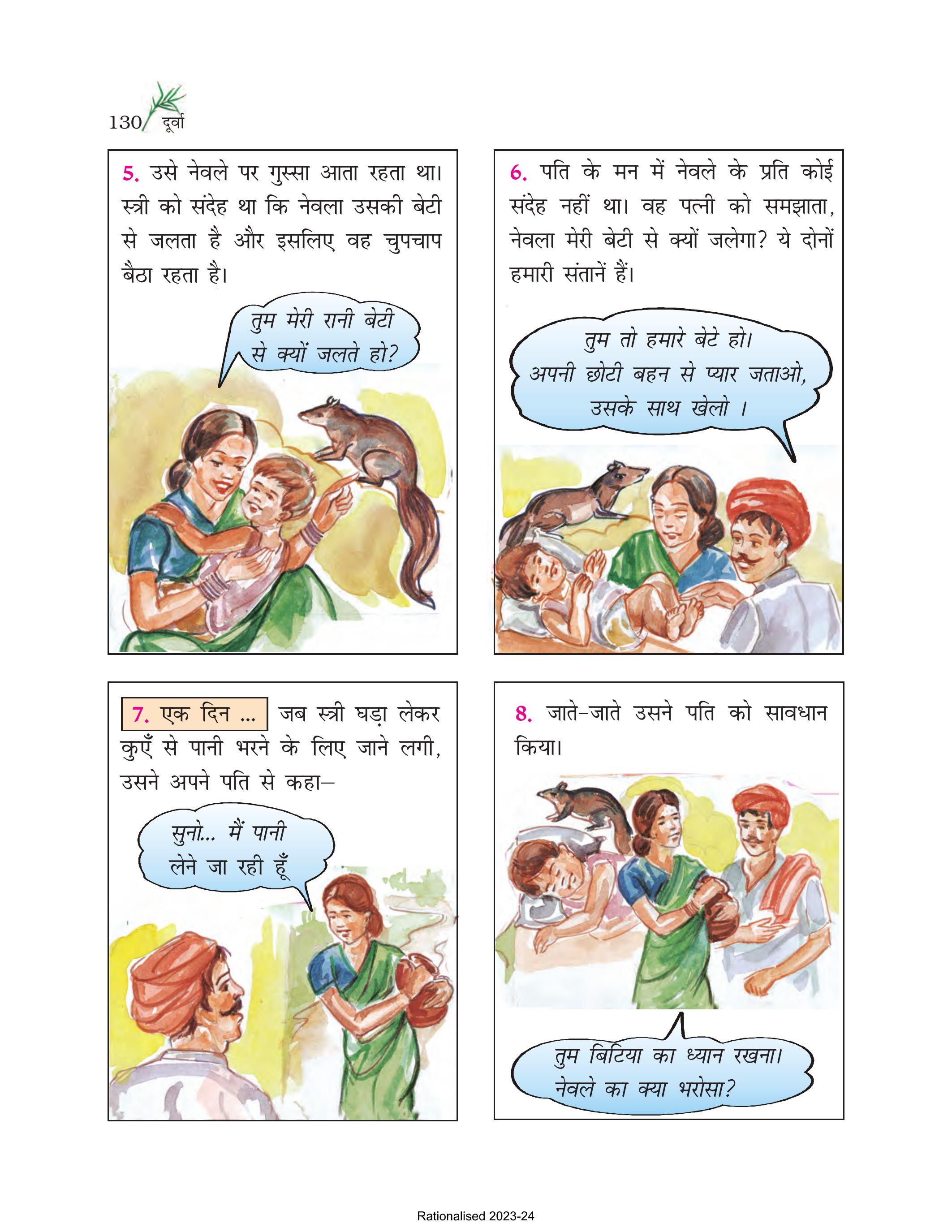 5. उसे नेवले पर गुस्सा आता रहता था। स्त्री को संदेह था कि नेवला उसकी बेटी से जलता है और इसलिए वह चुपचाप बैठा रहता है।