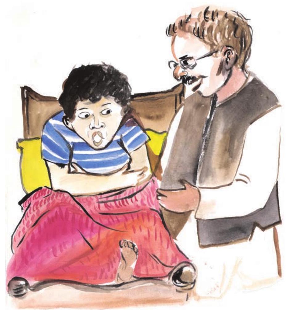 पिता : बस ‘ऐसे-ऐसे’ करता रहा। मैंने कहा - अरे, गड़गड़ होती है? तो बोला - नहीं। फिर पूछा-चाकू-सा चुभता है? तो जवाब दिया - नहीं। गोला-सा फूटता है? तो बोला - नहीं। जो पूछा उसका जवाब-नहीं। बस एक ही रट लगाता रहा, कुछ ‘ऐसे-ऐसे’ होता है।
