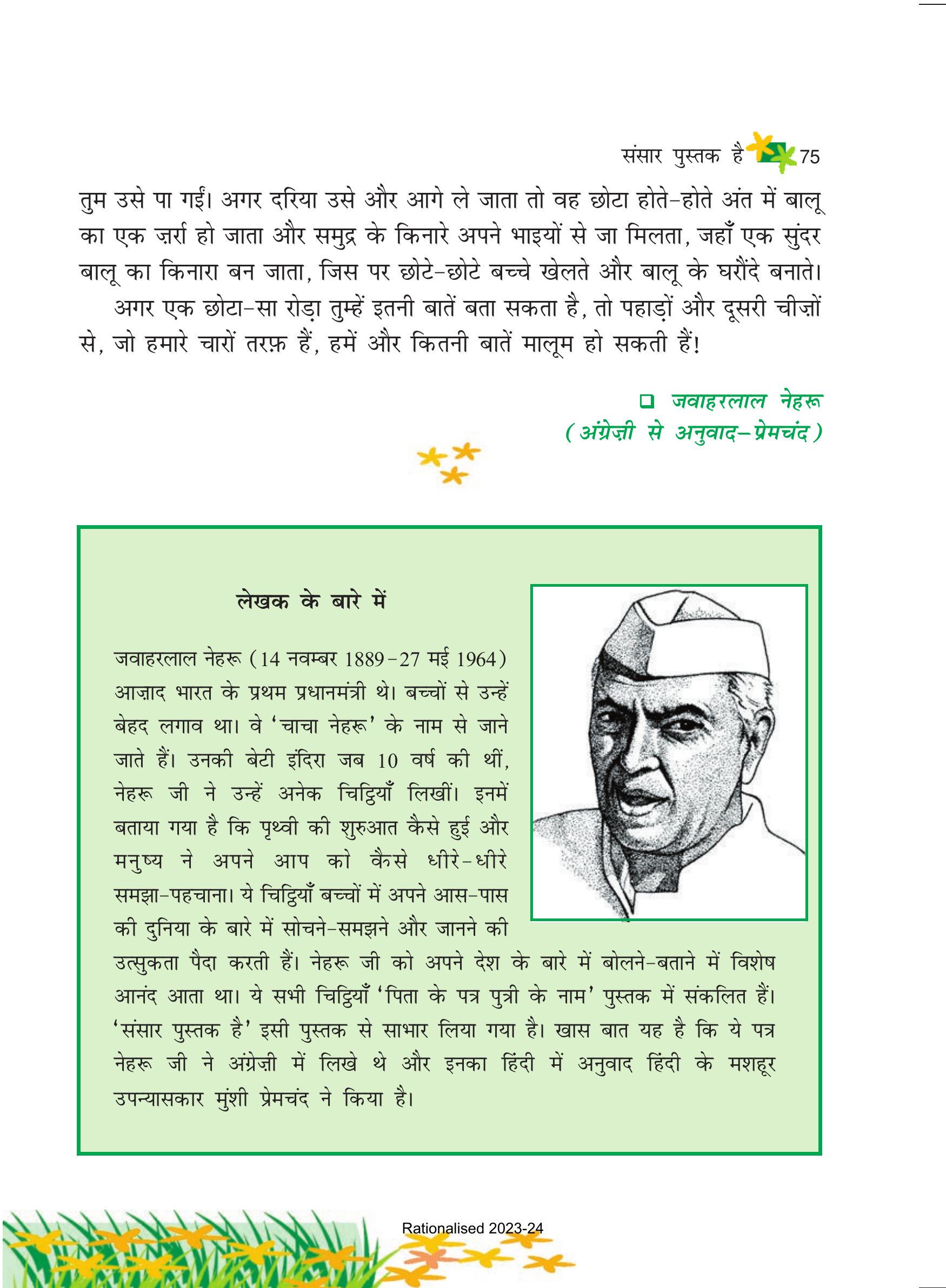 जवाहरलाल नेहरू (14 नवम्बर 1889-27 मई 1964) आज़ाद भारत के प्रथम प्रधानमंत्री थे। बच्चों से उन्हें बेहद लगाव था। वे ‘चाचा नेहरू’ के नाम से जाने जाते हैं। उनकी बेटी इंदिरा जब 10 वर्ष की थीं, नेहरू जी ने उन्हें अनेक चिट्वियाँ लिखों। इनमें बताया गया है कि पृथ्वी की शुरुआत कैसे हुई और मनुष्य ने अपने आप को कैठसे धीरे-धीरे समझा-पहचाना। ये चिट्रियाँ बच्चों में अपने आस-पास की दुनिया के बारे में सोचने-समझने और जानने की उत्सुकता पैदा करती हैं। नेहरू जी को अपने देश के बारे में बोलने-बताने में विशेष आनंद आता था। ये सभी चिट्डियाँ ‘पिता के पत्र पुत्री के नाम’ पुस्तक में संकलित हैं। ‘संसार पुस्तक है’ इसी पुस्तक से साभार लिया गया है। खास बात यह है कि ये पत्र नेहरू जी ने अंग्रेज़ी में लिखे थे और इसका हिंदी में अनुवाद हिंदी के मशहूर उपन्यासकार मुंशी प्रेमचंद ने किया है।