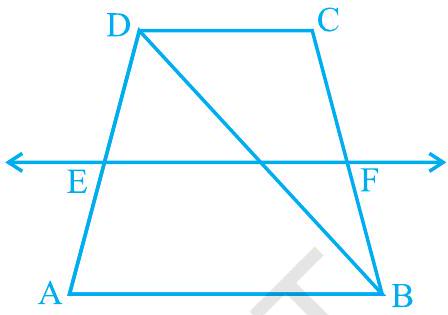 4. $\mathrm{ABCD}$ is a trapezium in which $\mathrm{AB} || \mathrm{DC}, \mathrm{BD}$ is a diagonal and $\mathrm{E}$ is the mid-point of $\mathrm{AD}$. A line is drawn through $E$ parallel to $A B$ intersecting $B C$ at $F$ (see Fig. 8.21). Show that $\mathrm{F}$ is the mid-point of $\mathrm{BC}$.