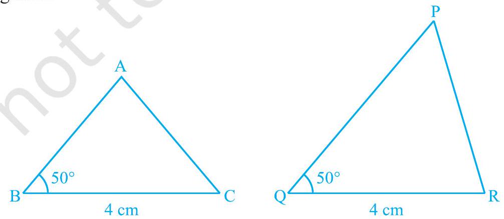 Now, draw two triangles with one side $4 \mathrm{~cm}$ and one angle $50^{\circ}$ (see Fig. 7.6). Are they congruent?