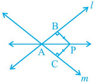 Solution : You are given that lines $l$ and $m$ intersect each other at A. Let PB $\perp l$, $\mathrm{PC} \perp m$. It is given that $\mathrm{PB}=\mathrm{PC}$.