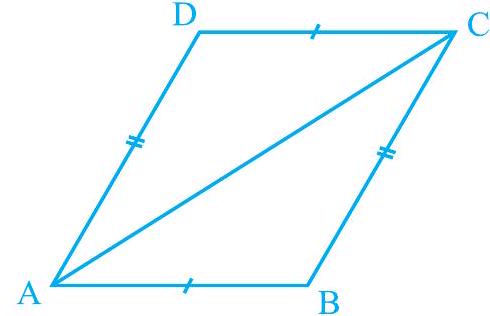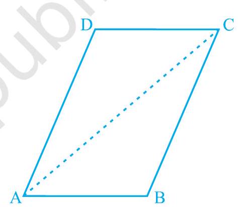 or, diagonal $\mathrm{AC}$ divides parallelogram $\mathrm{ABCD}$ into two congruent triangles $\mathrm{ABC}$ and $\mathrm{CDA}$.