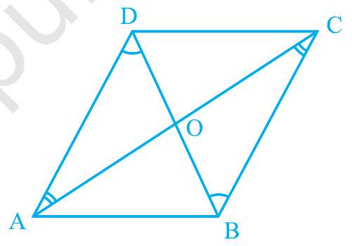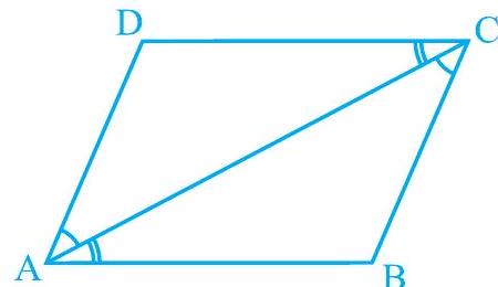 Proof : Let $A B C D$ be a parallelogram and $A C$ be a diagonal (see Fig. 8.2). Observe that the diagonal $\mathrm{AC}$ divides parallelogram $\mathrm{ABCD}$ into two triangles, namely, $\triangle \mathrm{ABC}$ and $\triangle \mathrm{CDA}$. We need to prove that these triangles are congruent.