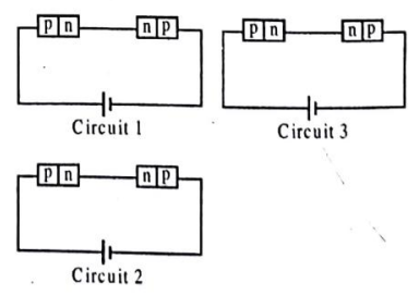 6. Two identical p-n junctions may be connected in series with a battery in three different ways as shown in the circuit diagrams. In which circuit diagrm will the potential drop across the p-n junctions be equal?