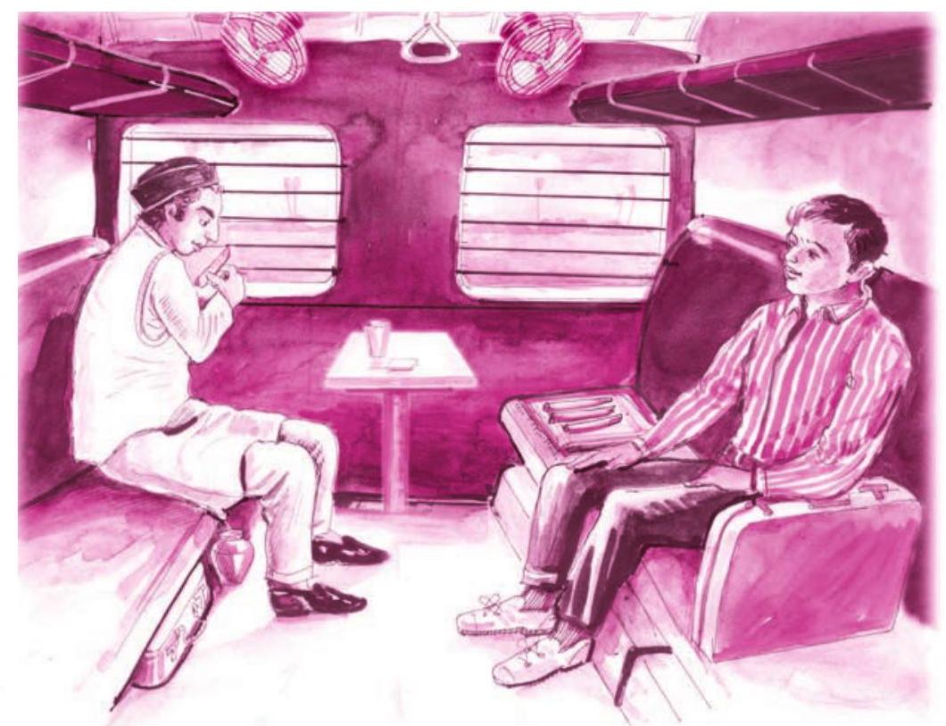 नवाब साहब ने फिर एक पल खिड़की से बाहर देखकर गौर किया और दृढ़ निश्चय से खीरों के नीचे रखा तौलिया झाड़कर सामने बिछा लिया। सीट के नीचे से लोटा उठाकर दोनों खीरों को खिड़की से बाहर धोया और तौलिए से पोंछ लिया। जेब से चाकू निकाला। दोनों खीरों के सिर काटे और उन्हें गोदकर झाग निकाला। फिर खीरों को बहुत एहतियात से छीलकर फाँकों को करीने से तौलिए पर सजाते गए।