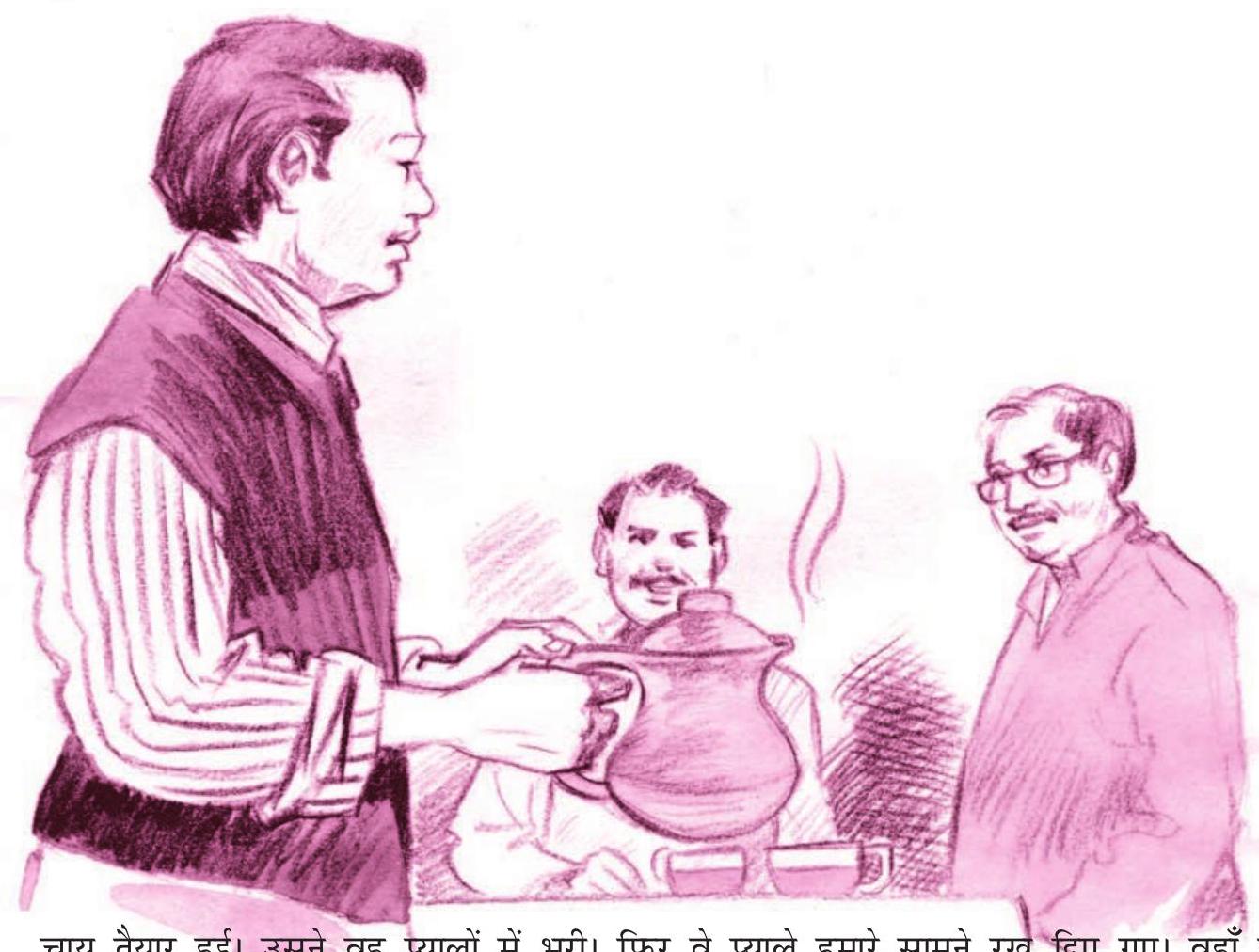 चाय तैयार हुई। उसने वह प्यालों में भरी। फिर वे प्याले हमारे सामने रख दिए गए। वहाँ हम तीन मित्र ही थे। इस विधि में शांति मुख्य बात होती है। इसलिए वहाँ तीन से अधिक आदमियों को प्रवेश नहीं दिया जाता। प्याले में दो घूँट से अधिक चाय नहीं थी। हम ओठों से प्याला लगाकर एक-एक बूँद चाय पीते रहे। करीब डेढ़ घंटे तक चुसकियों का यह सिलसिला चलता रहा।