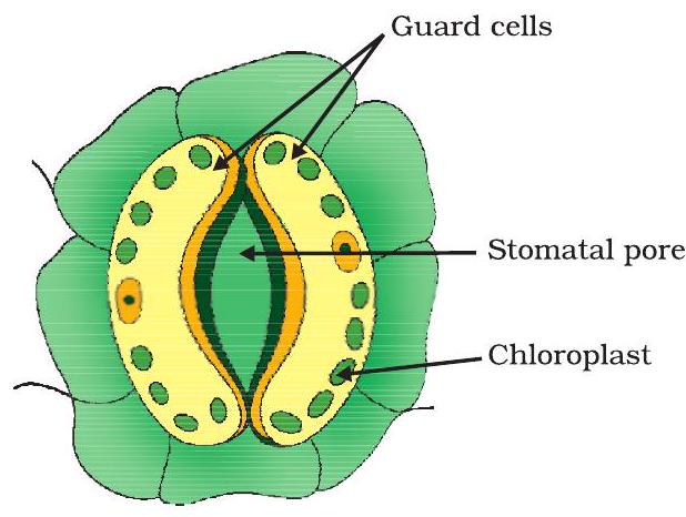 Now, let us study how the plant obtains carbon dioxide. In Class IX, we had talked about stomata (Fig. 5.3) which are tiny pores present on the surface of the leaves. Massive amounts of gaseous exchange takes place in the leaves through these pores for the purpose of photosynthesis. But it is important to note here that exchange of gases occurs across the surface of stems, roots and leaves as well. Since large amounts of water can also be lost through these stomata, the plant closes these pores when it does not need carbon dioxide for photosynthesis. The opening and closing of the pore is a function of the guard cells. The guard cells swell when water flows into them, causing the stomatal pore to open. Similarly the pore closes if the guard cells shrink.