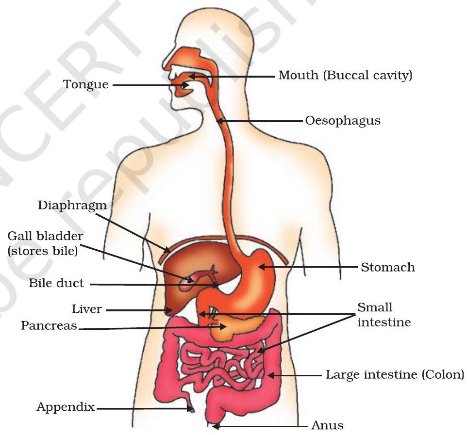 The alimentary canal is basically a long tube extending from the mouth to the anus. In Fig. 5.6, we can see that the tube has different parts. Various regions are specialised to perform different functions. What happens to the food once it enters our body? We shall discuss this process here.