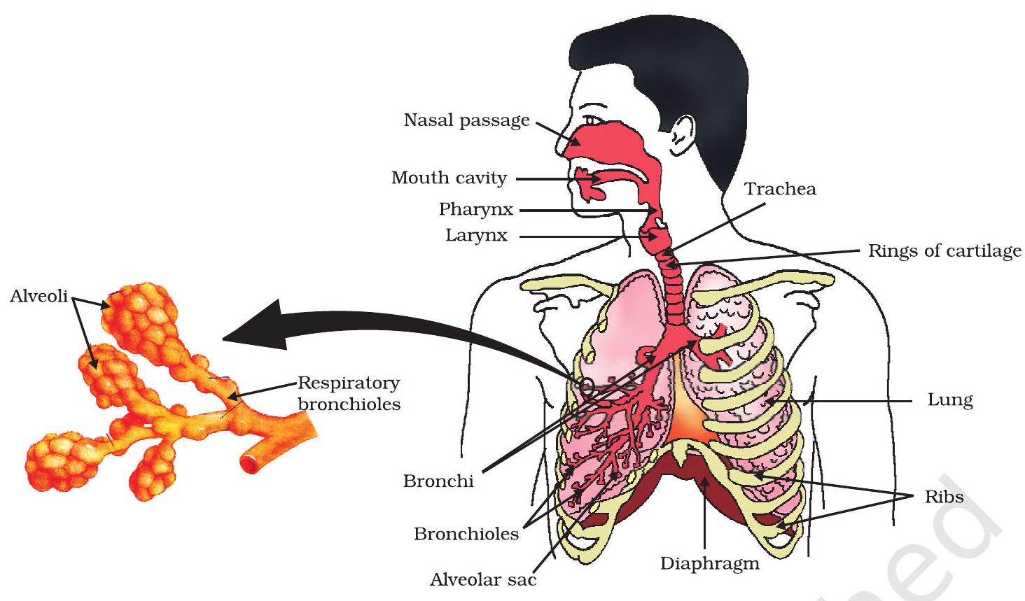 The alveoli are the small balloon-like structures present in the lungs. The walls of the alveoli consist of extensive network of blood vessels. Each lung contains 300-350 million alveoli, making it a total of approximately 700 million in both the lungs. The alveolar surface when spread out covers about $80 m 2$ area. This large surface area makes the gaseous exchange more efficient.