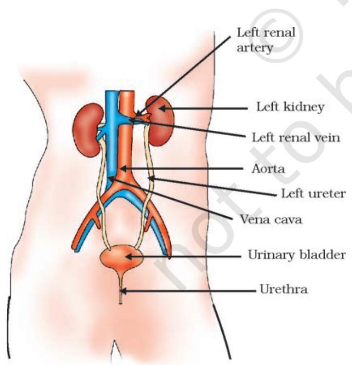 The urine formed in each kidney enters a long tube called ureter. From ureter, it gets transported to the urinary bladder and then into the urethra.