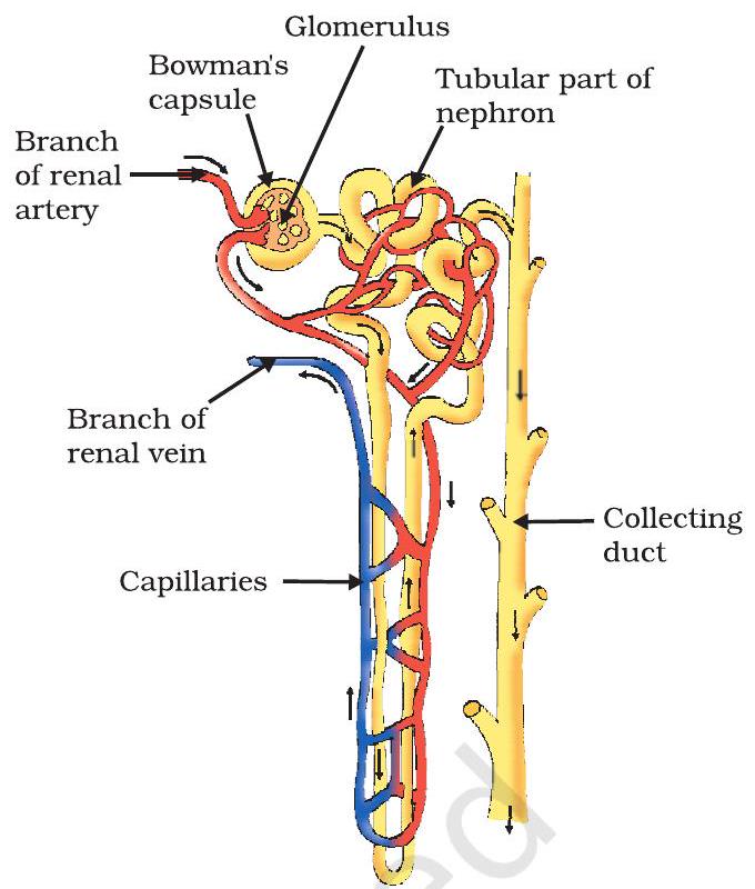 - The blood enters the kidney through the renal artery, which branches into many capillaries associated with glomerulus.