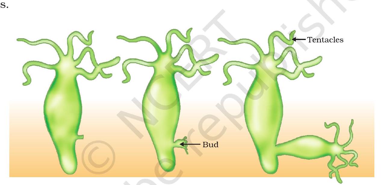 Organisms such as Hydra use regenerative cells for reproduction in the process of budding. In Hydra, a bud develops as an outgrowth due to repeated cell division at one specific site (Fig. 7.4). These buds develop into tiny individuals and when fully mature, detach from the parent body and become new independent individuals.