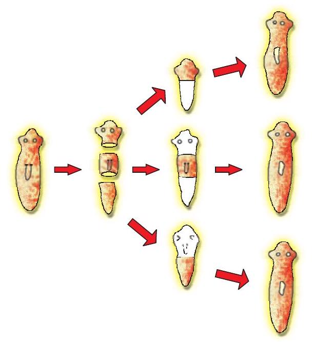 Many fully differentiated organisms have the ability to give rise to new individual organisms from their body parts. That is, if the individual is somehow cut or broken up into many pieces, many of these pieces grow into separate individuals. For example, simple animals like Hydra and Planaria can be cut into any number of pieces and each piece grows into a complete organism. This is known as regeneration (see Fig. 7.3). Regeneration is carried out by specialised cells. These cells proliferate and make large numbers of cells. From this mass of cells, different cells undergo changes to become various cell types and tissues. These changes take place in an organised sequence referred to as development. However, regeneration is not the same as reproduction, since most organisms would not normally depend on being cut up to be able to reproduce.
